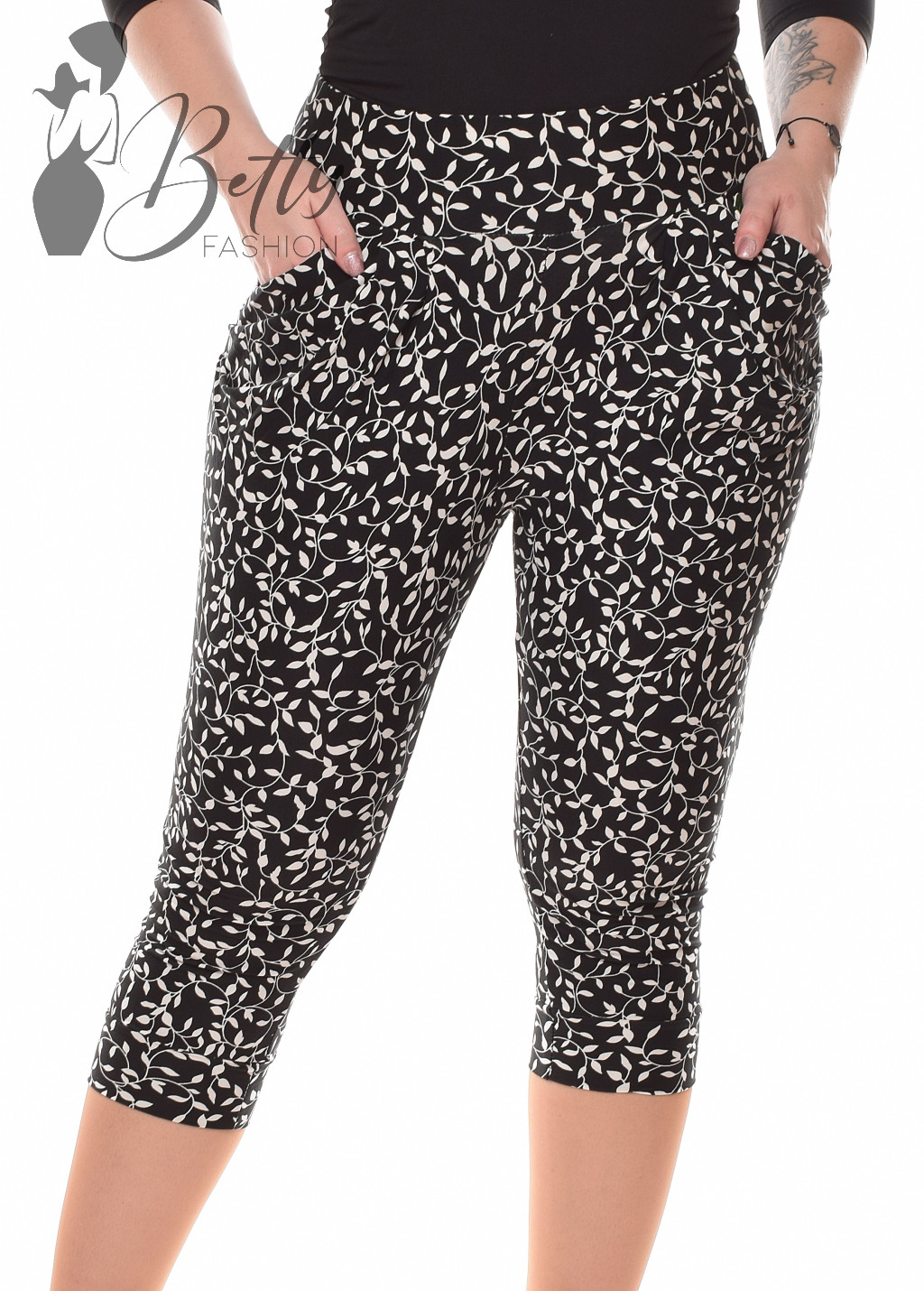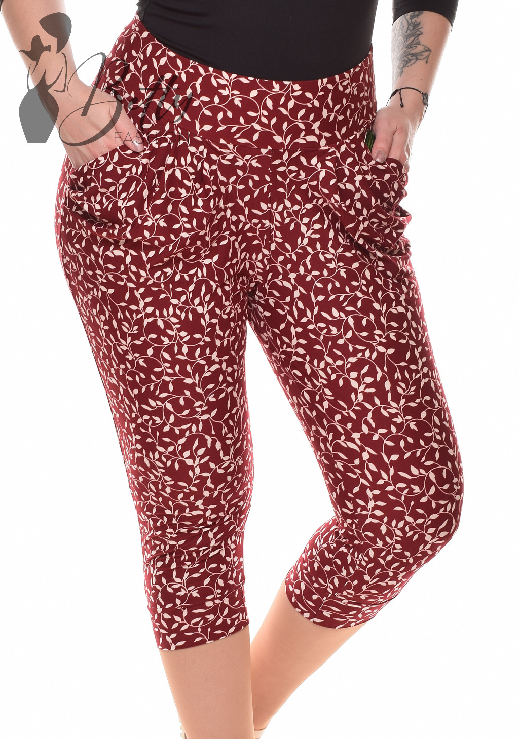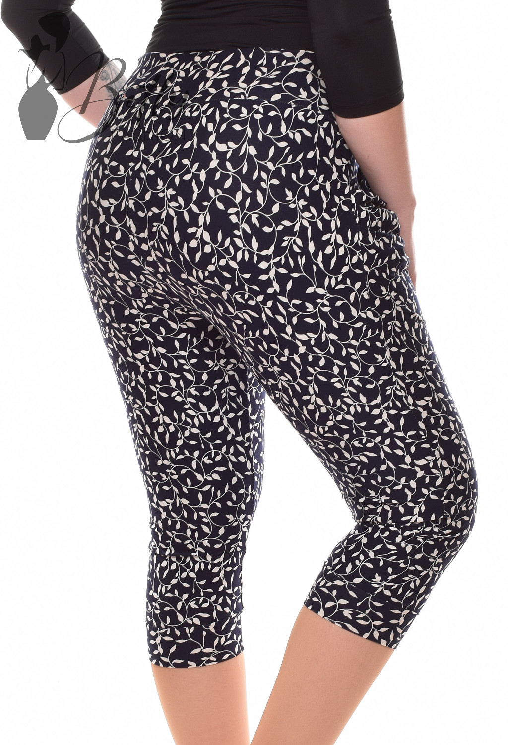 Apró levélmintás, gumírozott és rakott derekú, elején zsebes térdnadrág