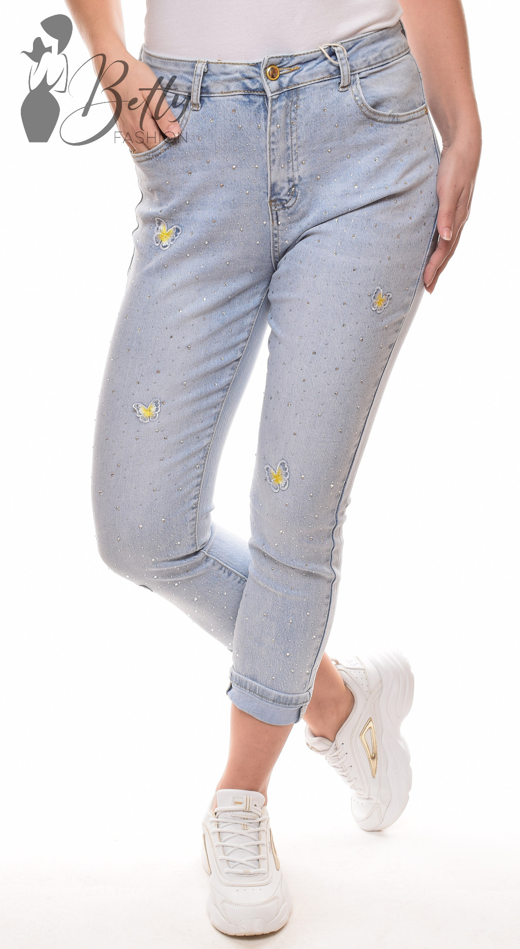 Halványkék színű, hímzett pillangó mintás és strasszköves farmer nadrág