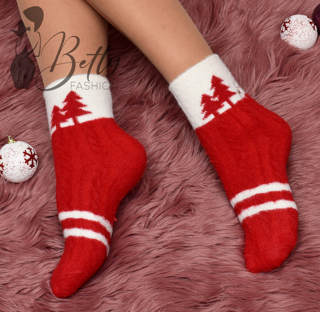 Piros alapon karácsonyfa és rénszarvas mintás, meleg, szőrmés anyagú zokni